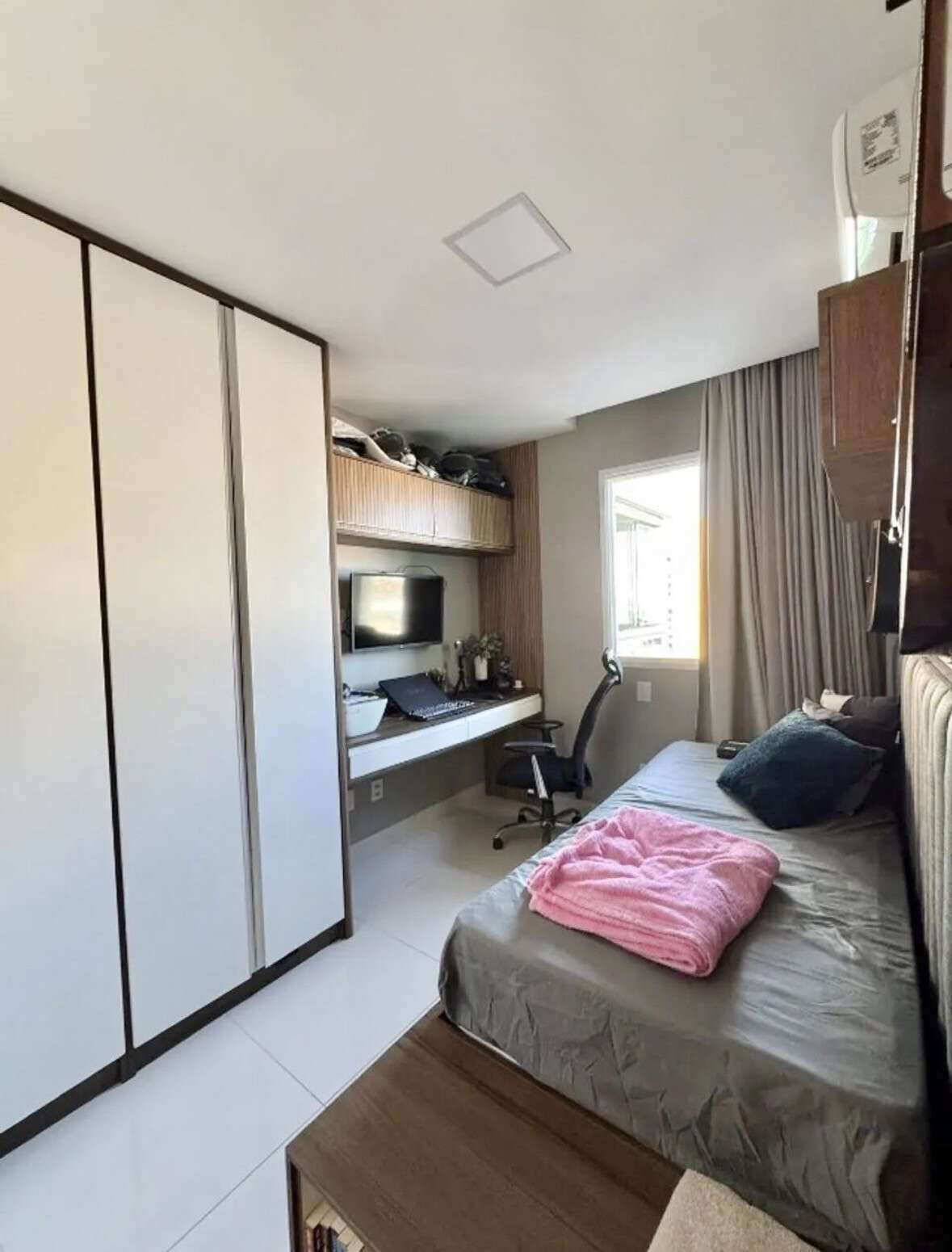Com 75 m² de área privativa, o apartamento apresenta um projeto inteligente e funcional, dispondo atualmente de 2 quartos, sendo 1 suíte, ambientes bem planejados, com móveis modulados.