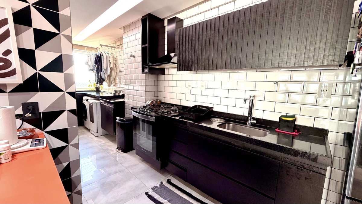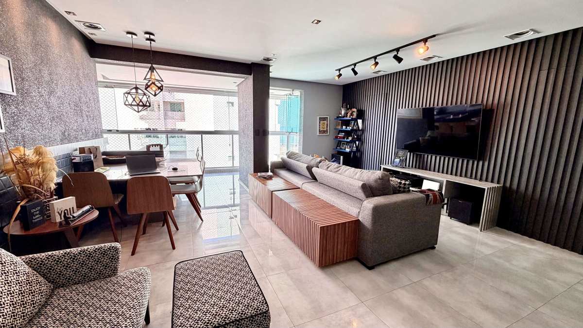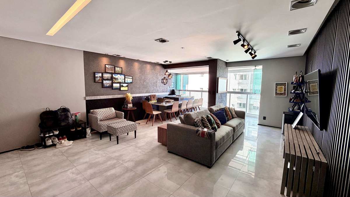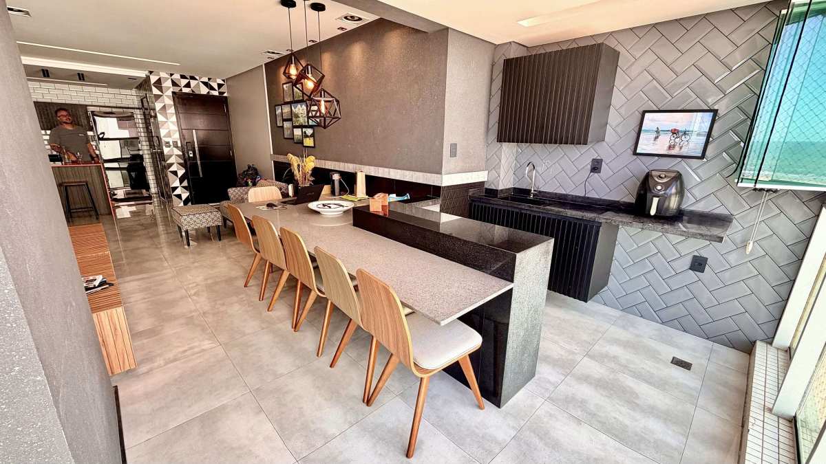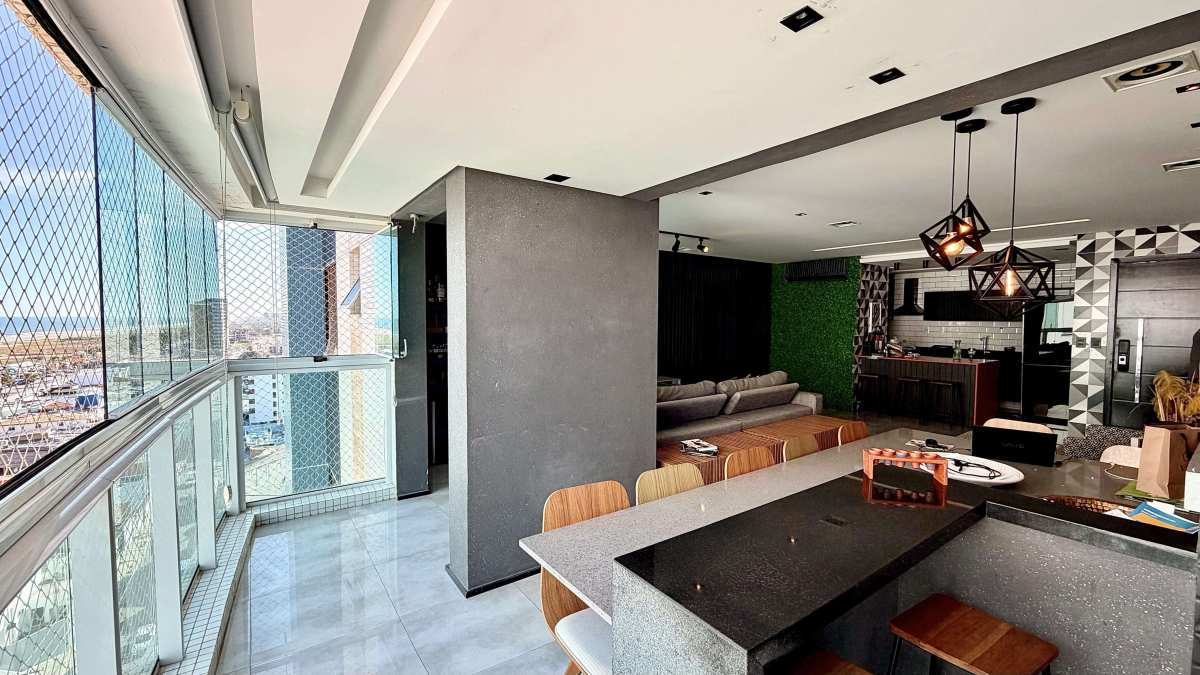 A área social integra sala ampla com projeto de iluminação e sistema de som, conectada à varanda com vista panorâmica para o mar. Cozinha americana com marcenaria de alto padrão, área de serviço independente e WC de serviço.