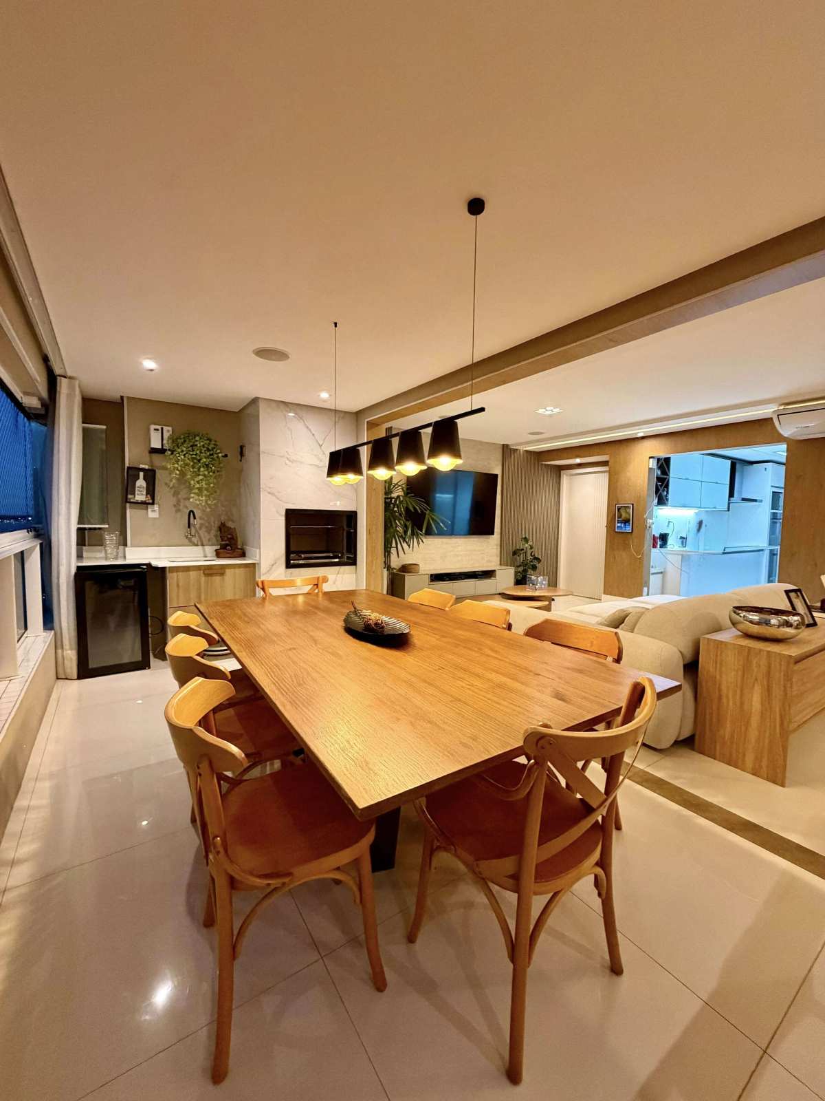 * Varanda gourmet integrada à sala, com churrasqueira e marcenaria sob medida